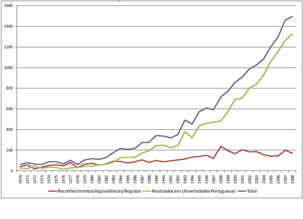 O número de pessoas que concluem esta etapa de formação teve um aumento exponencial nos últimos anos. Segundo os dados do MCTES, cerca de 200 pessoas tiveram o seu doutoramento reconhecido em Portugal em 1985, passando a cerca de 600 em 1996 e a cerca de 1500 em 2008. Se analisarmos o gráfico 1, esse incremento deveu-se maioritariamente a doutoramento feitos em instituições de Ensino Superior Portuguesas, dado que os reconhecimentos/equivalências tiveram um aumento bastante menos expressivo. Em 1983, o número de doutoramentos feitos em instituições portuguesas era basicamente equivalente ao de doutoramentos feitos em instituições estrangeiras. Hoje, esse número é cerca de 5 vezes superior.